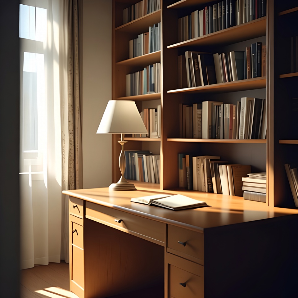 book collection, books, bookshelves, bookshelves full, cozy interior, curtains, desk lamp, fabric lamp, home library, lamp, literature, natural light, office desk, open book, open notebook, quiet room, reading desk, reading nook, sheer curtains, study area, study room, sunlight, warm lighting, window, wooden desk, wooden furniture, wooden shelves, library