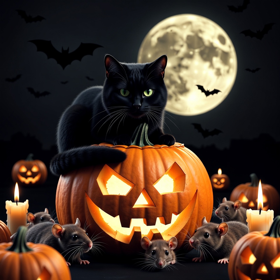 A black cat with green eyes sits atop a large carved jack-o'-lantern pumpkin with glowing eyes and mouth. Surrounding the pumpkin are multiple smaller lit pumpkins, rats, bats, and candles on a dark background. A full moon and flying bats appear in the night sky.