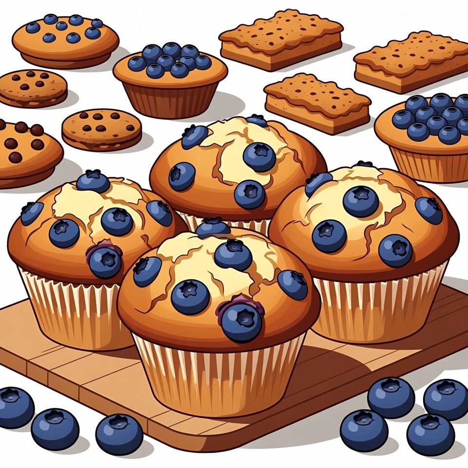 baked goods, blueberries, breakfast food, clipart, cookies, crackers, dessert, food illustration, fresh berries, illustration, isolated background, muffins, orange muffins, pastries, vector art, wooden board, blueberry muffins