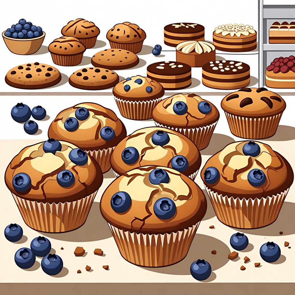 A vibrant illustration displays an assortment of blueberry muffins and cakes on a white bakery counter. Fresh blueberries are scattered around the muffins, with some in bowls and on shelves behind. Various pastries including chocolate and cream-topped cakes are arranged in a realistic vector art style.