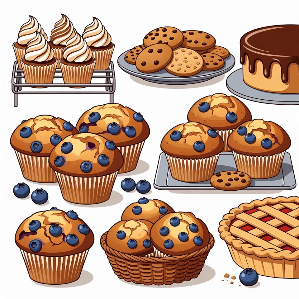 baked goods, basket, blueberries, blueberry muffins, chocolate cake, chocolate chip cookies, clipart, cookies, desserts, food illustration, frosting, illustration, isolated background, lattice pie, muffins, pastries, pie, plate, sweet treats, tray, vector art, white background, cupcakes
