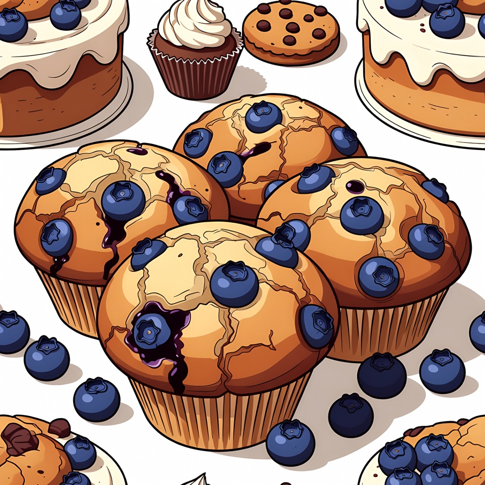 baked goods, blueberries, cake, chocolate cookies, clipart, cupcake, dessert, food art, fresh fruit, gourmet dessert, illustration, isolated background, juicy blueberries, muffins, pastry, pattern design, sweet treats, whipped cream, white background, blueberry muffins