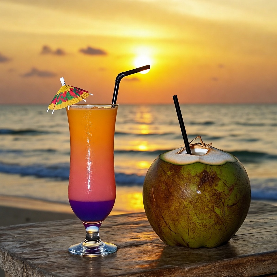 Tropical Drinks with Sunset Beach