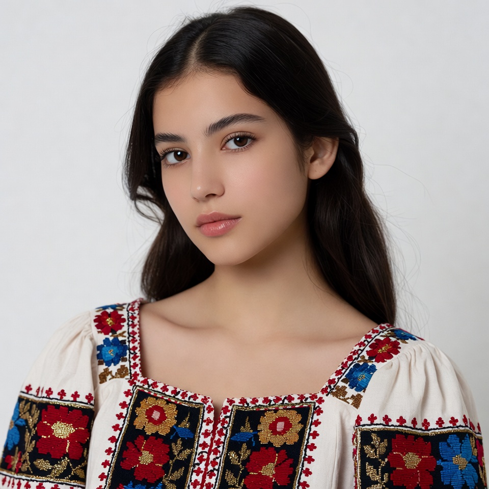 A young woman with long dark hair stands against a white background wearing a white off-shoulder blouse adorned with intricate red, blue, and black floral embroidery. She has a subtle smile and direct gaze at the camera. The detailed embroidery features vibrant flowers and patterns on the neckline and sleeves.