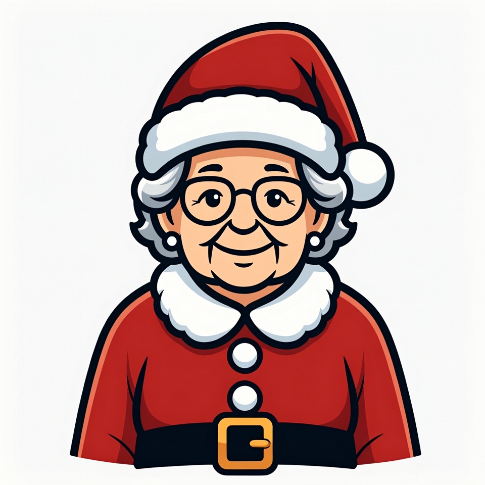 A cartoon illustration of an elderly White woman wearing a red Santa hat with white trim and pom-pom. She has curly white hair, round eyeglasses, and a smiling expression. She wears a red Santa dress with white fur collar, black belt, and white buttons on an isolated white background.