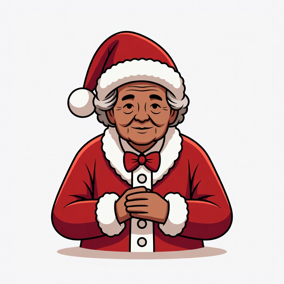 A cartoon illustration of an elderly Asian woman wearing a red Santa hat with white fur trim and pom-pom. She has a joyful expression with wrinkled skin and gray hair peeking out, dressed in a red Santa jacket with white fur trim and a red bow tie. Her hands are clasped together in front of her on a white isolated background.