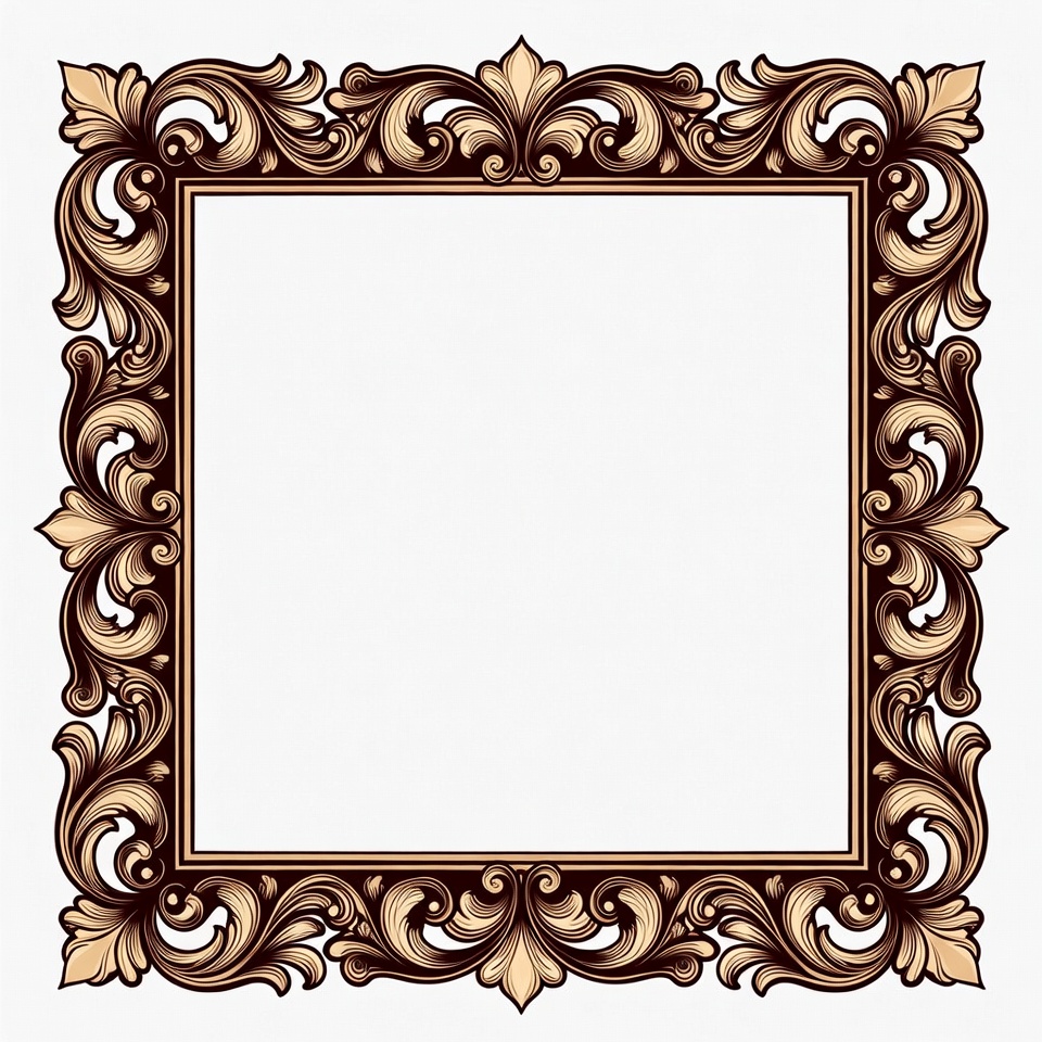 An intricate gold and black ornamental frame features elaborate floral and scroll designs. The frame has a vintage baroque style with acanthus leaves and curved motifs. The center is completely empty on a white background.