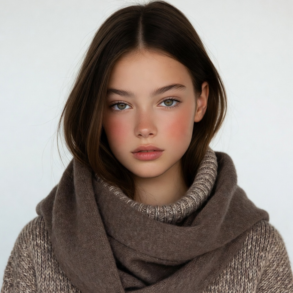 A young woman with long wavy brown hair gazes at the camera against a white background. She has striking green eyes, flushed cheeks, and glossy lips. She wears a cozy brown knit scarf wrapped around her neck.