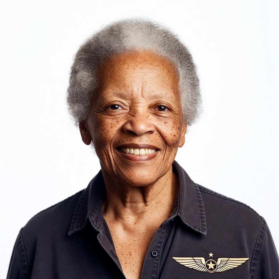 An elderly African-American woman with short curly gray hair smiles warmly at the camera. She wears a dark collarless shirt featuring gold wing and star emblems on the chest. The portrait is set against a plain white background.