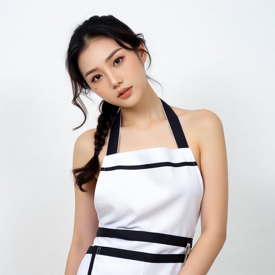 A young Asian woman with long dark hair styled in a braid tilts her head and smiles softly at the camera. She wears a white apron with black straps over her shoulders and around her waist, standing against a plain white background. Her expression is gentle and approachable.