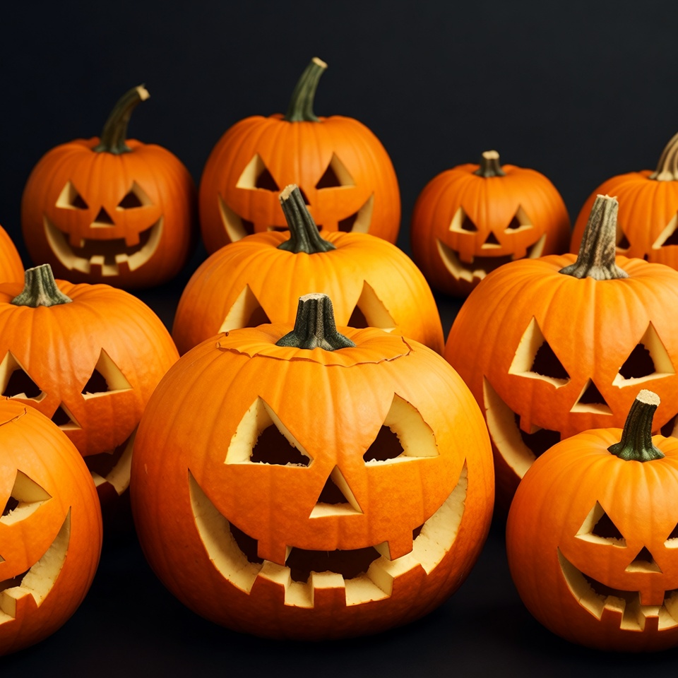 Multiple carved jack-o-lantern pumpkins with glowing orange faces and jagged smiles are arranged in a group. They feature triangular eyes and spooky expressions, illuminated against a solid black background. The pumpkins have green stems and detailed cutouts.
