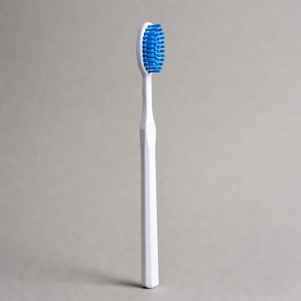 A white-handled toothbrush with blue bristles stands upright against a plain gray background. The toothbrush has a straight handle and densely packed blue nylon bristles. It is isolated for clear visibility.
