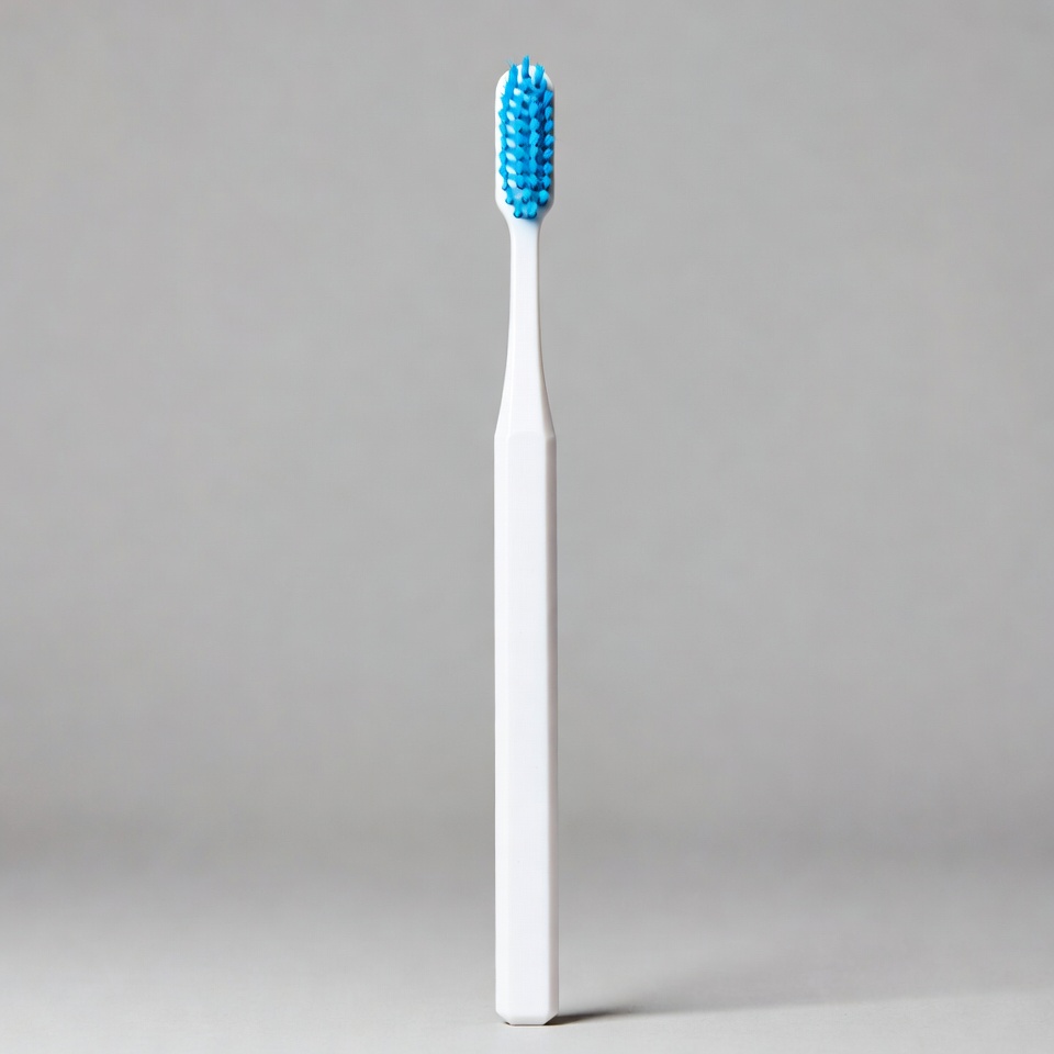 A white-handled toothbrush with blue bristles stands upright on a plain gray surface. The toothbrush is centered and isolated against the solid background. Its handle is straight and slim with a subtle shadow beneath.