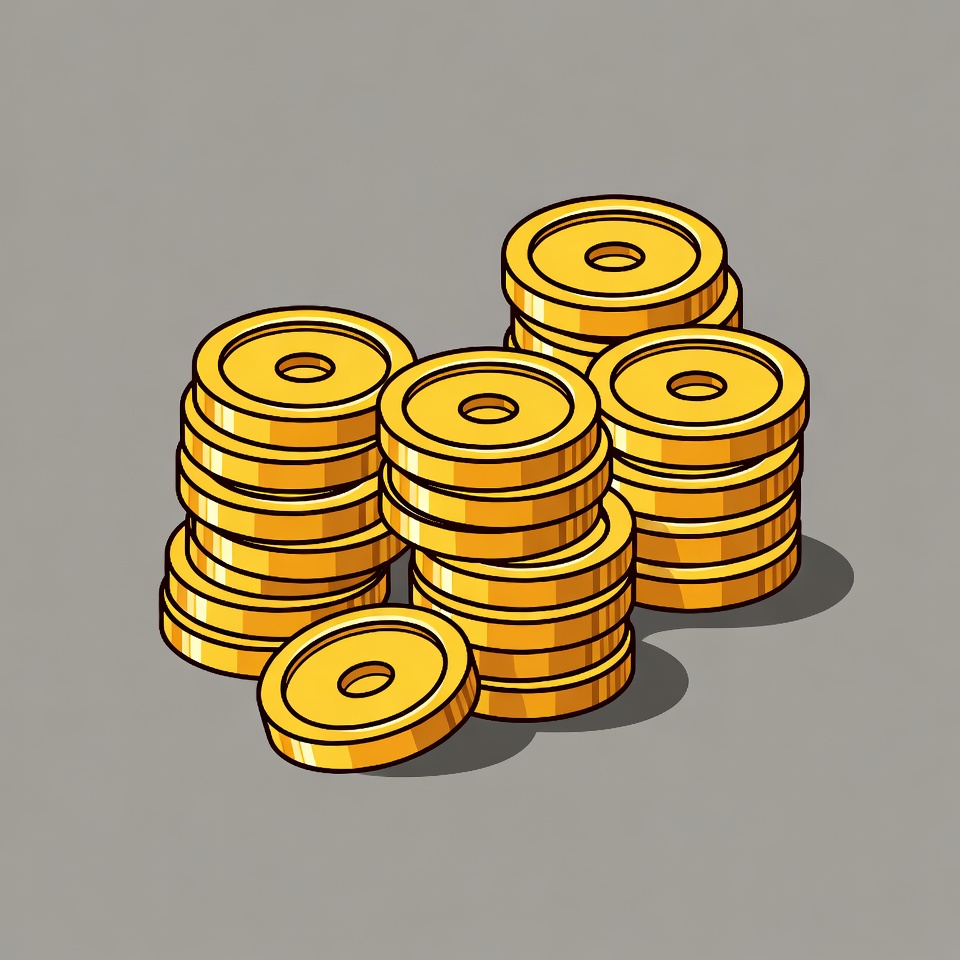 A vibrant illustration shows multiple stacks of shiny golden coins on a gray background. The coins are depicted in a flat, cartoonish style with bright yellow coloring and subtle shadows for depth. They are arranged in several piles, isolated against the plain backdrop.