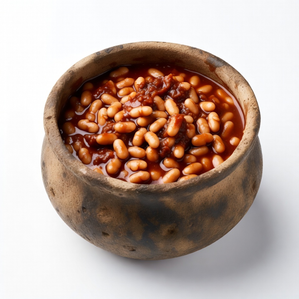 bean dish, beans, clay pot, cooking, dish, earthenware, food, isolated, meal, pottery, red sauce, rustic pot, savory food, tomato sauce, top view, white background, baked beans
