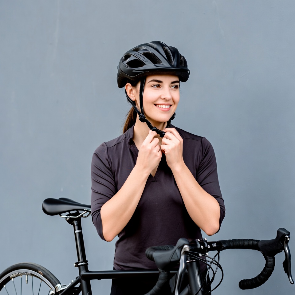 A smiling woman with dark hair in a ponytail adjusts the strap of her black cycling helmet. She wears a dark gray top and stands next to a black road bike with drop handlebars against a gray background. Her hands are positioned near her chin as she fastens the helmet.