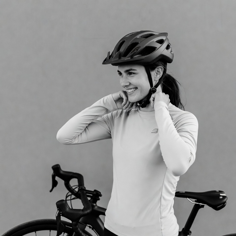 White, adjusting straps, bicycle, bike helmet, black helmet, cycling gear, cycling helmet, cyclist, drop handlebars, female, fitness, gray jersey, happy woman, isolated background, long sleeve jersey, outdoor bike, ponytail, portrait, road bike, smiling, sportswear, woman cyclist, woman