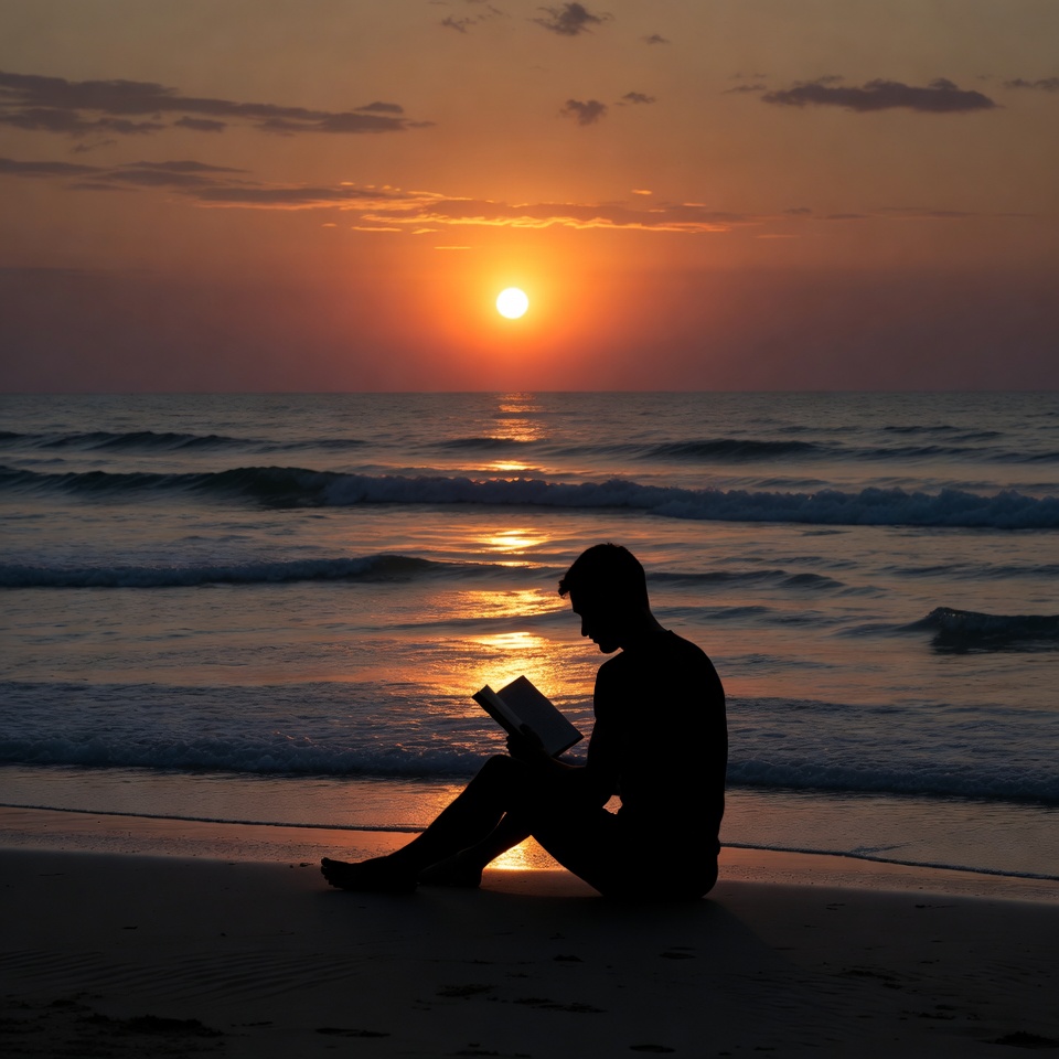 A silhouette of a man sits on the beach reading a book as the sun sets over the ocean. Gentle waves lap at the shore behind him, with a vibrant orange sky and scattered clouds. His figure is dark against the glowing sunset horizon.