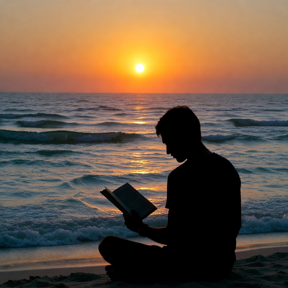 A silhouette of a man sits cross-legged on the sandy beach, reading an open book as the sun sets over the ocean. Gentle waves lap at the shore behind him, with vibrant orange and pink hues illuminating the sky. His dark outline contrasts sharply against the glowing sunset.