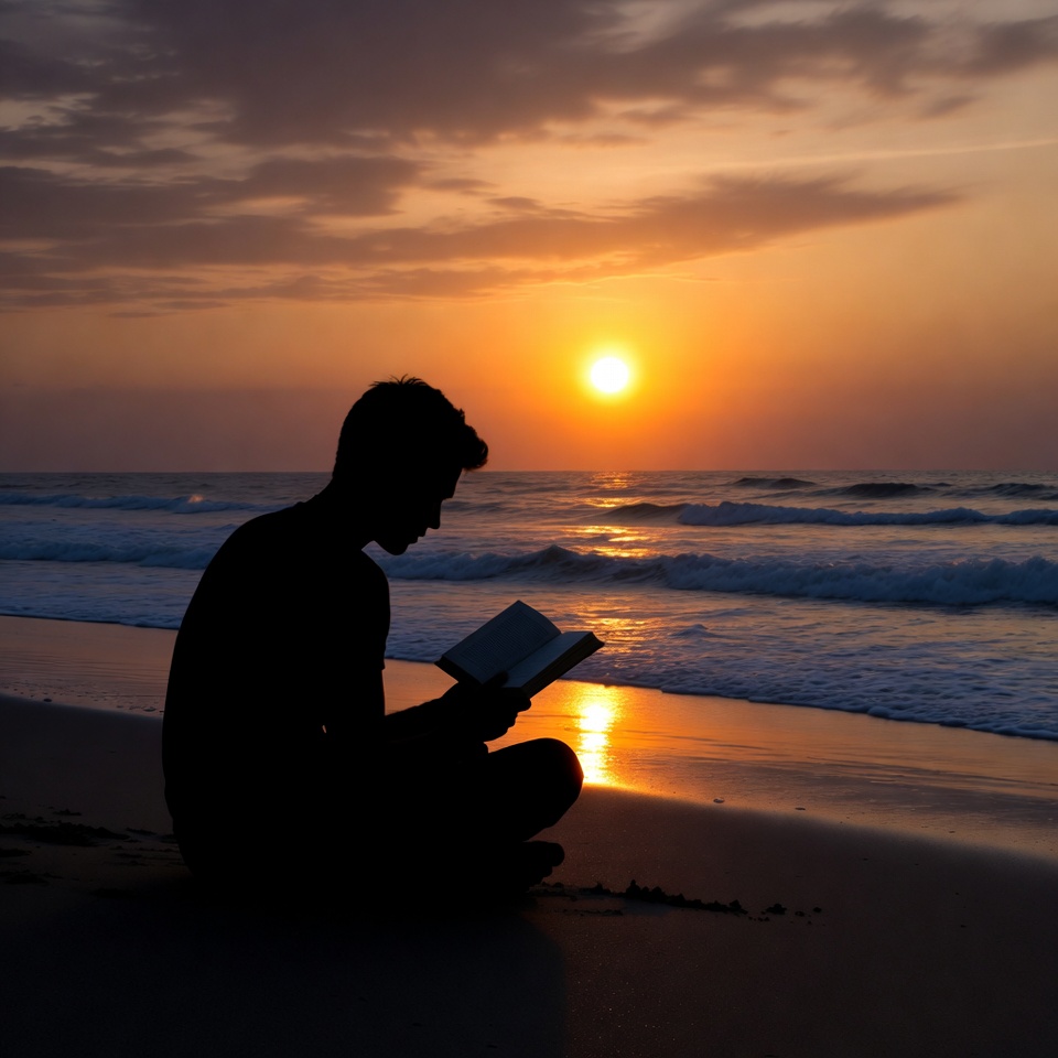 A silhouette of a man sits cross-legged on the beach, intently reading an open book. The vibrant sunset sky with the sun low on the horizon casts an orange glow over the ocean waves crashing nearby. His dark outline contrasts sharply against the colorful evening seascape.