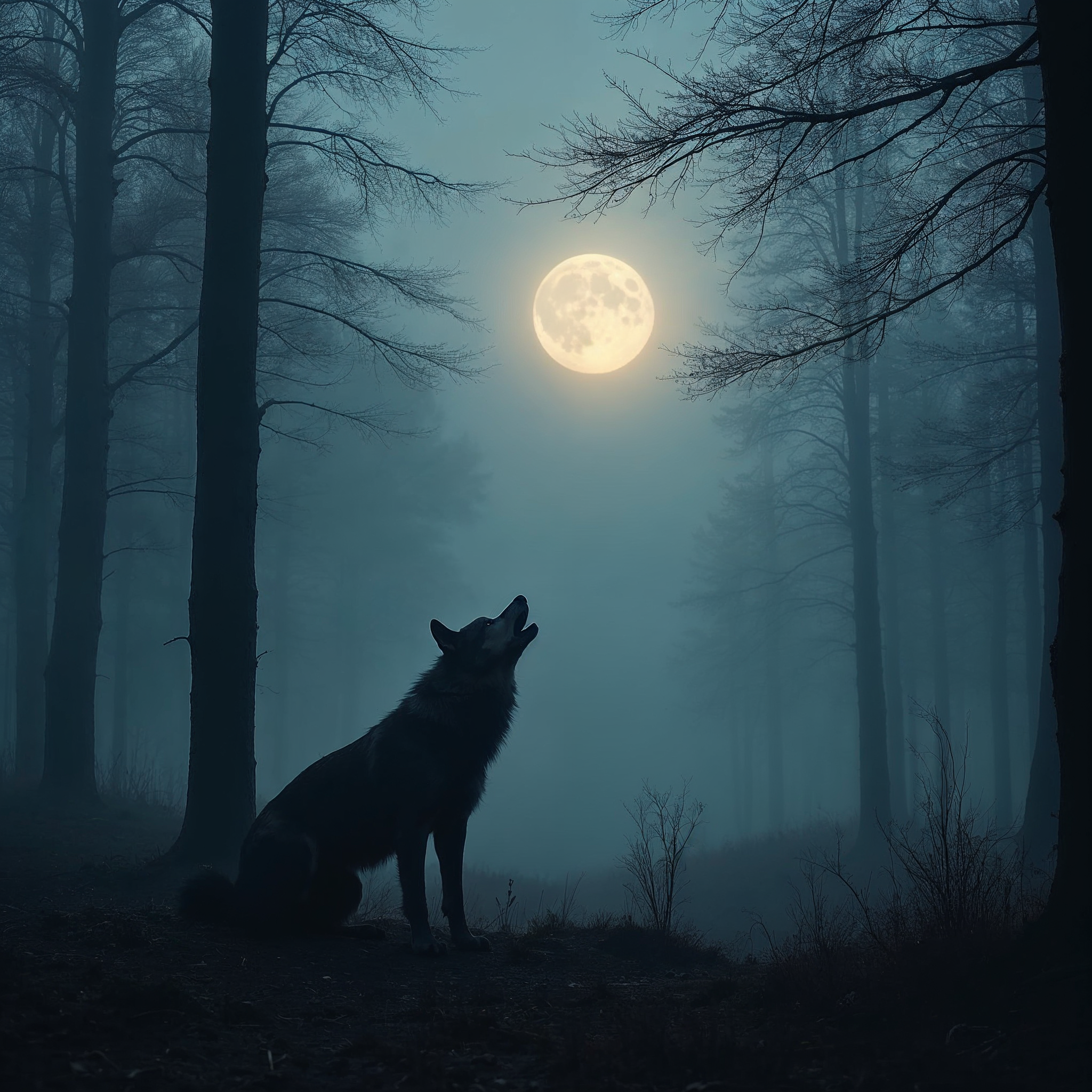 A black wolf sits on the ground in a misty forest and howls at a large full moon above. Bare trees with thin branches surround the scene under a dark blue night sky. Fog drifts through the woodland, creating an ethereal atmosphere.