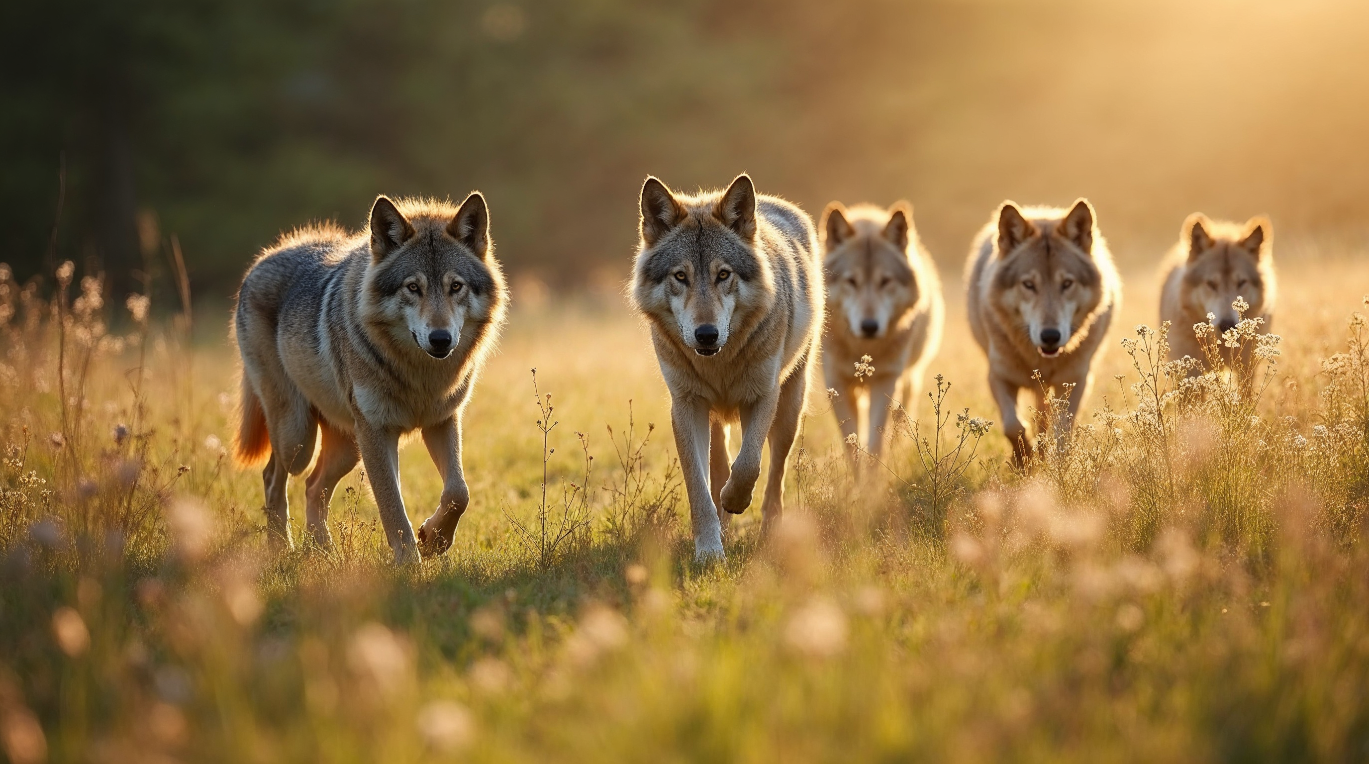 Five gray wolves walk through a field of tall grass during golden hour sunlight. They move forward with alert expressions, surrounded by blurred green and yellow vegetation. The warm lighting highlights their fur and creates a serene natural scene.