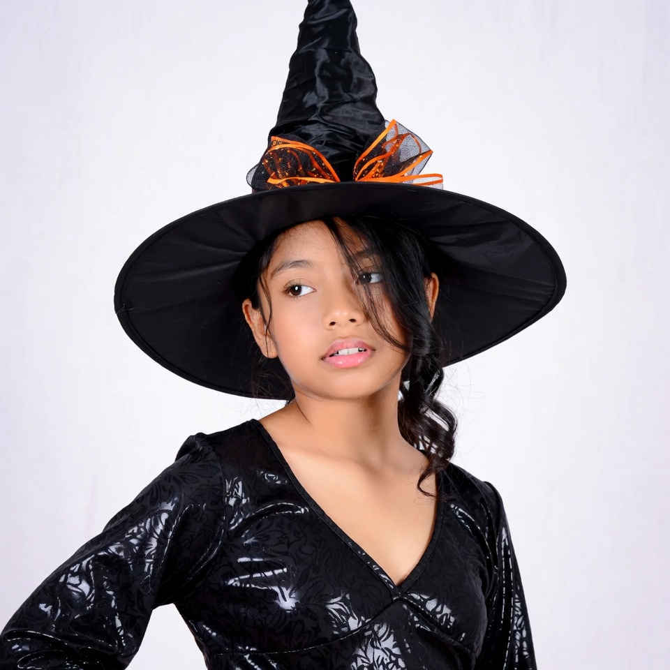 Asian, Halloween, Halloween costume, black hat, costume, dark hair, female, girl, glossy lips, isolated background, long sleeves, orange trim, pointed hat, pouty lips, shiny dress, side ponytail, v-neck, white background, witch hat, young girl, witch costume