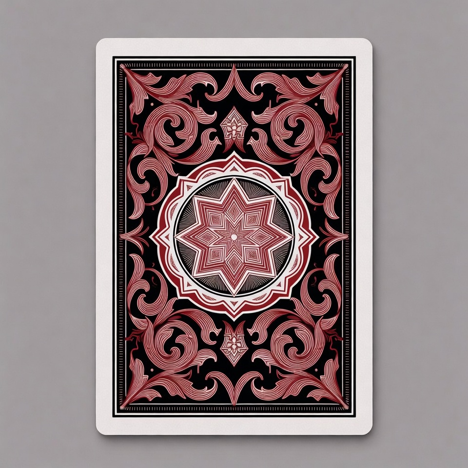 black patterns, card back, casino card, deck card, floral motifs, intricate art, isolated background, ornate, poker card, red design, scrolls, starburst, symmetrical, white background, playing card