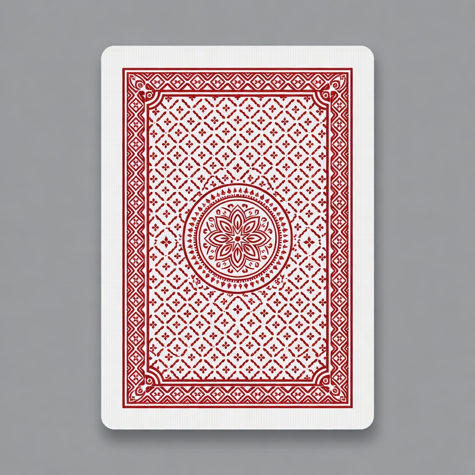 A standard bicycle playing card back features a white center with intricate red geometric patterns and a central red mandala flower design. The edges are framed by a thick red border with decorative corner motifs. The card is isolated on a gray background.