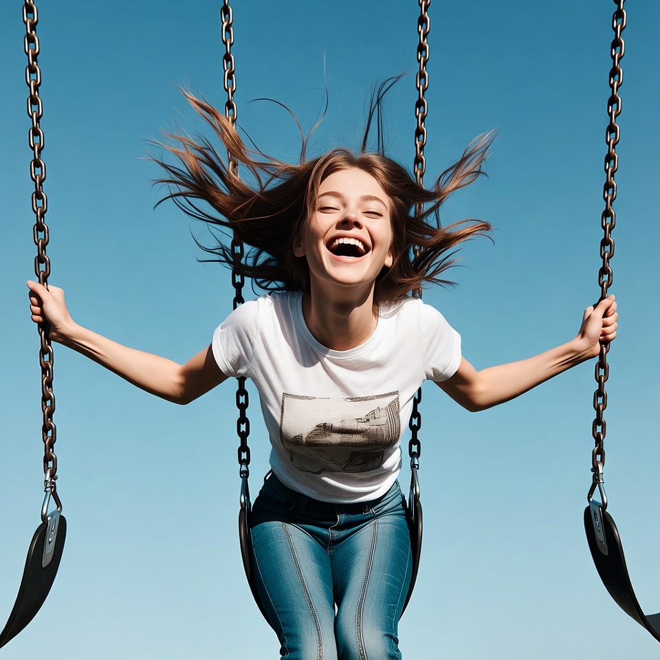 White, blue jeans, blue sky, brown hair, chains, female, flying hair, graphic tee, laughing, long hair, outdoor, playground swing, smile, swinging, white t-shirt, woman, young woman, girl