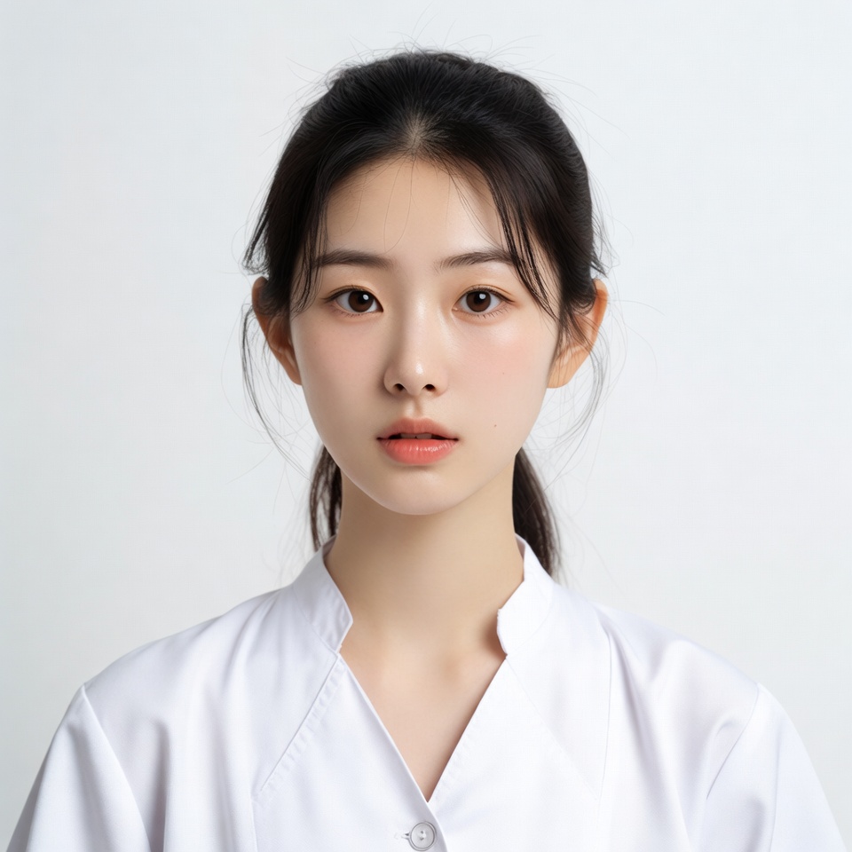 Asian, East Asian, V-neck, black hair, clinic attire, doctor uniform, female, headshot, healthcare worker, isolated background, medical uniform, neutral expression, nurse, ponytail, portrait, professional woman, smooth skin, white uniform, young woman, woman