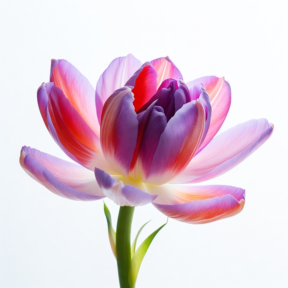 blooming flower, closeup flower, floral, flower, garden flower, green stem, isolated background, multicolored tulip, orange petals, pink tulip, purple tulip, spring flower, vibrant petals, white background, tulip
