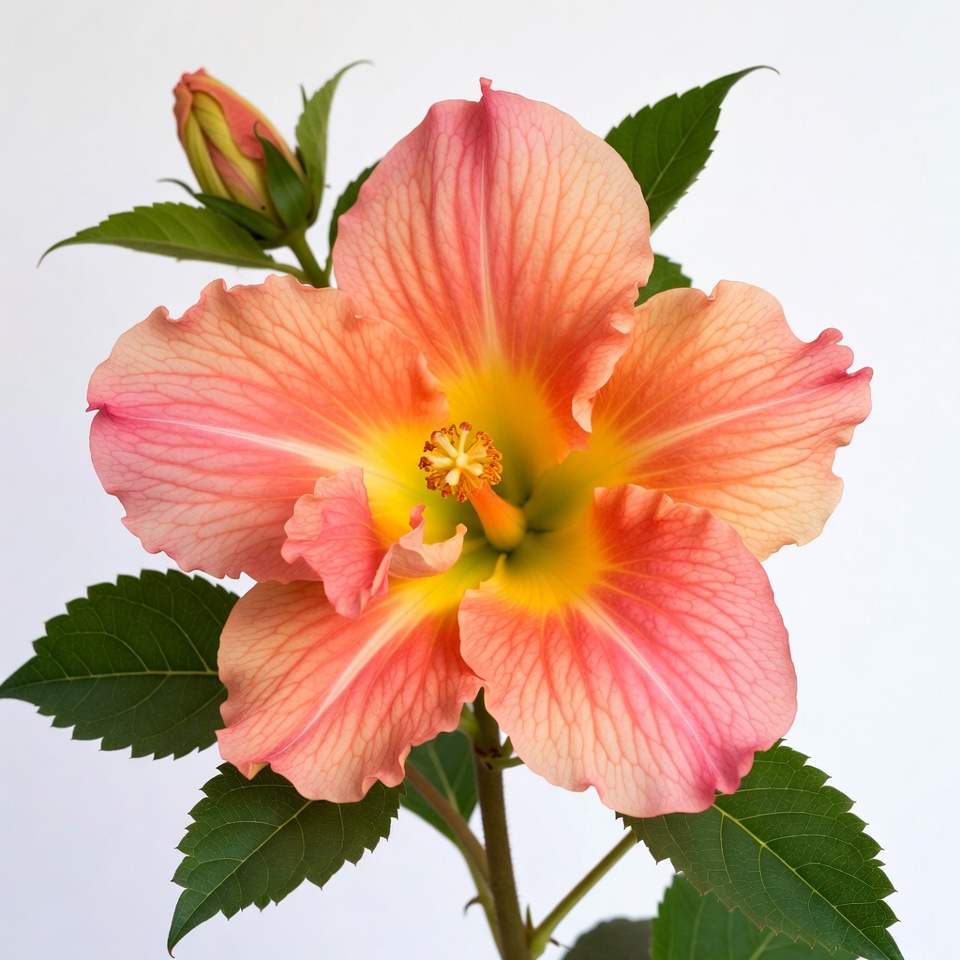bloom, closeup, flower, flower bud, green leaves, green stem, hibiscus, isolated background, orange accents, petals, pink hibiscus, ruffled petals, stamen, tropical flower, vibrant, white background, yellow center, hibiscus flower