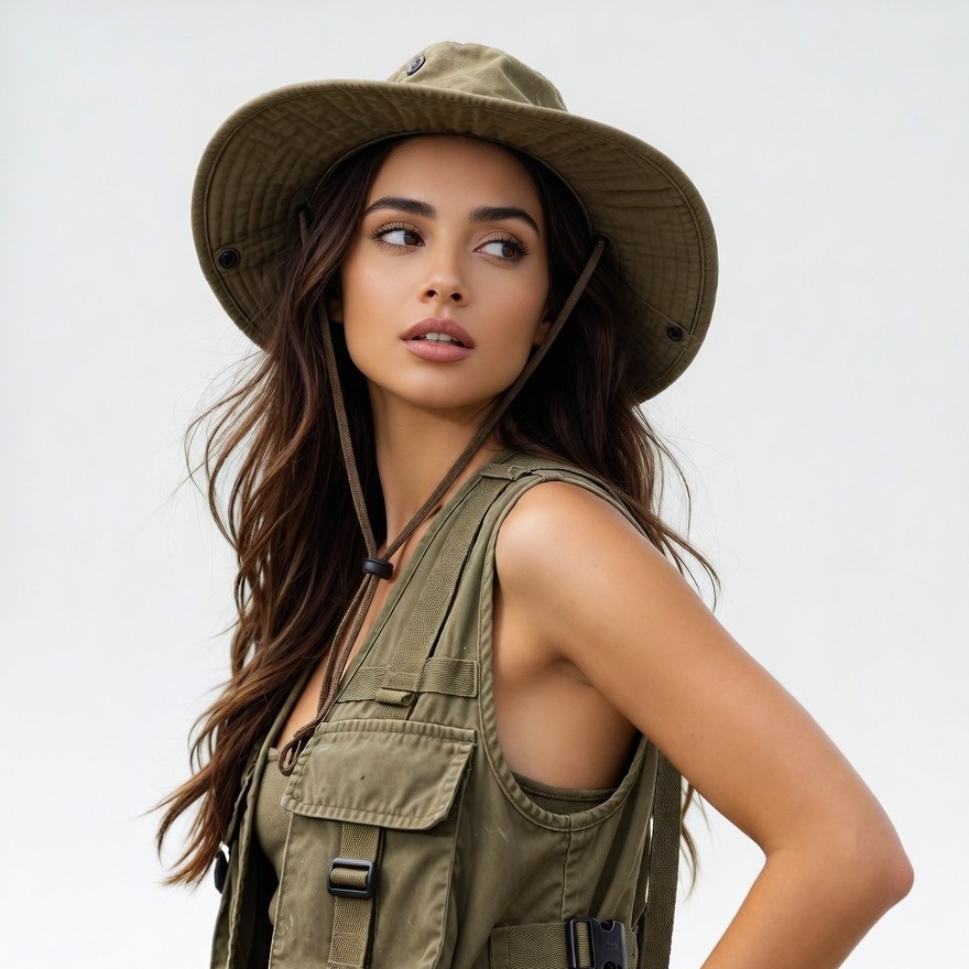 A young woman with long wavy brown hair wears a wide-brimmed khaki hat and a matching khaki vest over a tank top. She looks slightly to the side with a subtle smile on her face. The image is a close-up portrait against a plain background.