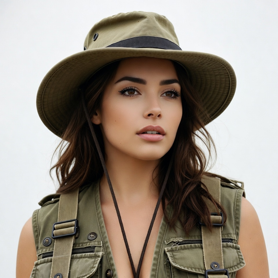 White, adventure wear, attractive, brown hair, bucket hat, cargo vest, closeup, fashion, female, green hat, green vest, isolated background, khaki hat, military hat, model pose, outdoor gear, portrait, stylish, wavy hair, woman
