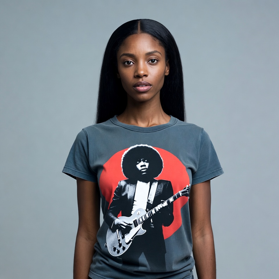 A Black woman with long straight black hair stands frontally wearing a gray short-sleeve t-shirt. The t-shirt features a large black-and-white illustration of Jimi Hendrix playing an electric guitar on a red circular background. She has a neutral expression and is posed against a plain gray background.
