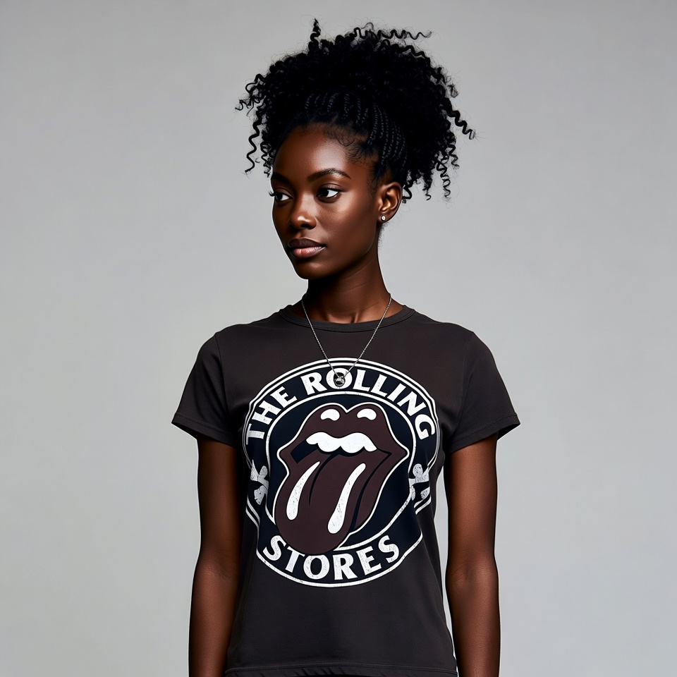 A young African-American woman with curly black hair stands against a plain gray background. She wears a black short-sleeved t-shirt featuring the Rolling Stones logo with the iconic tongue emblem. Her expression is neutral as she looks slightly to the side.
