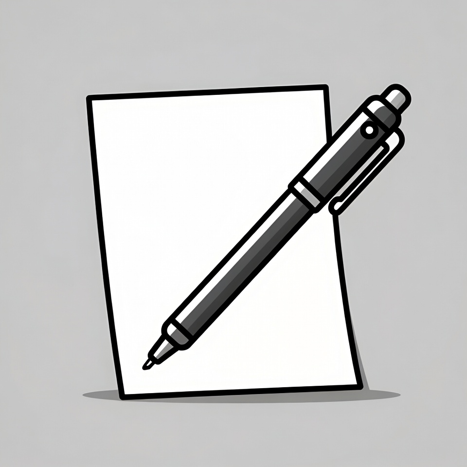 A simple line art illustration shows a white blank sheet of paper standing upright on a gray background. A black ballpoint pen with a clip rests diagonally against the paper's edge. The pen's tip points toward the paper, suggesting readiness to write.