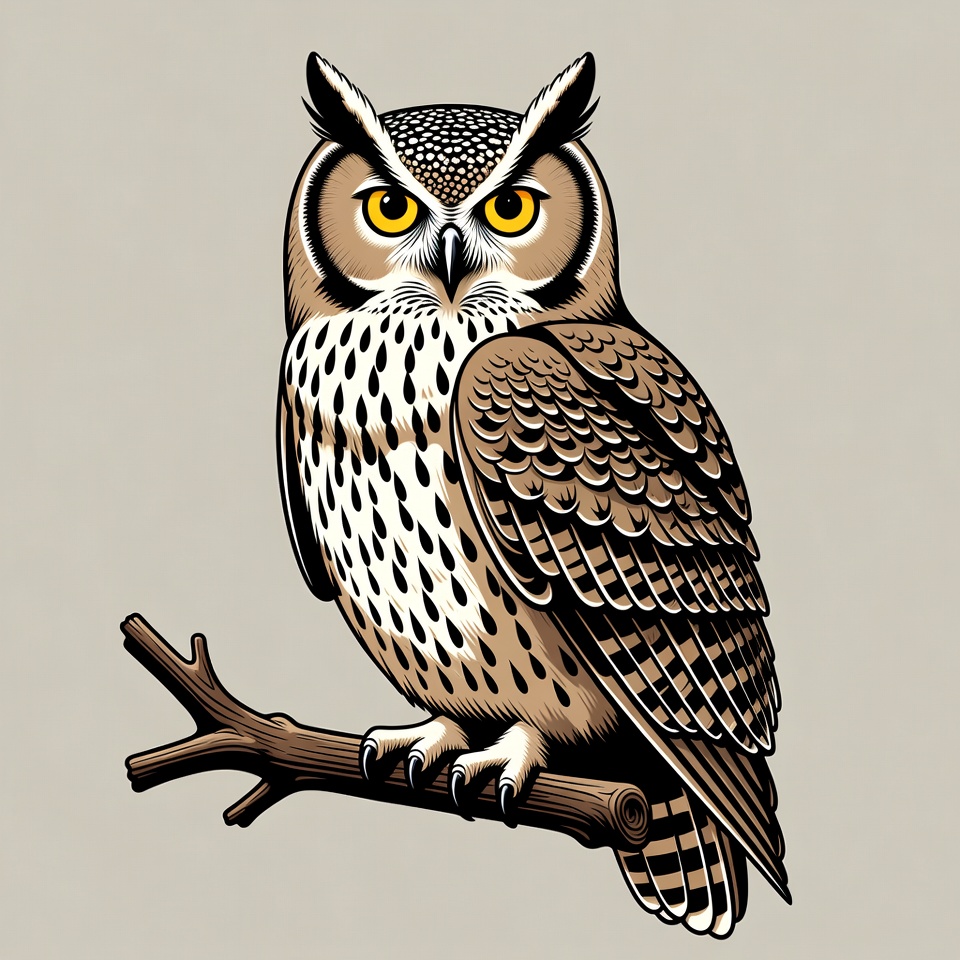 A detailed illustration of a great horned owl perched on a tree branch. The owl features prominent ear tufts, bright yellow eyes, and intricate brown and white feather patterns. It faces forward against a plain gray background.