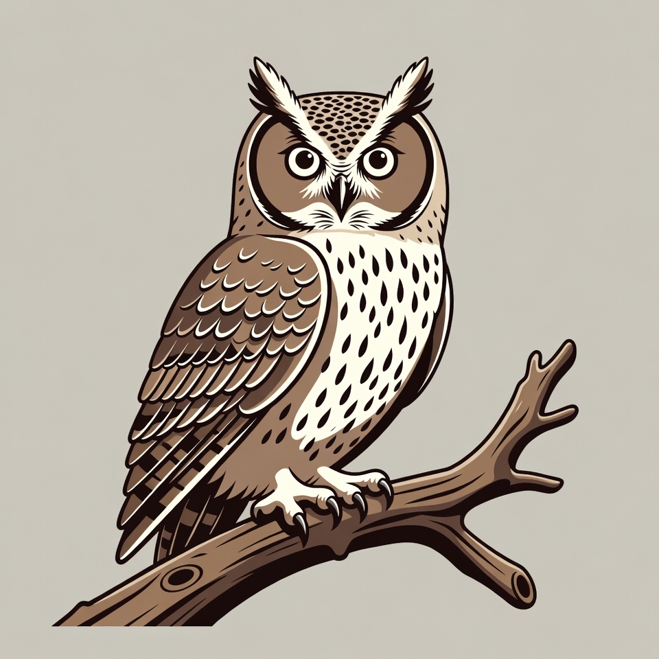 animal, bird, branch, brown owl, clipart, ear tufts, feathers, feathers pattern, illustration, isolated background, large eyes, nature, perched, talons, tree branch, vector art, wildlife, wise owl, owl