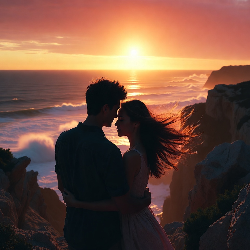 A man and woman stand in silhouette on rocky cliffs overlooking the ocean, embracing closely as the sun sets. Vibrant pink and orange hues fill the sky, with waves crashing below and her long hair flowing in the wind. He wears a dark shirt while she dons a light dress.