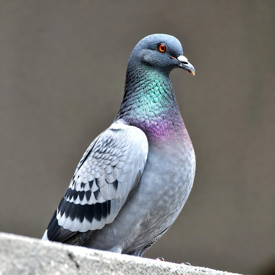 avian, bird, black wings, closeup, concrete ledge, dove, feathers, gray feathers, gray pigeon, iridescent neck, neck feathers, perched bird, profile view, red eyes, rock dove, shiny plumage, urban bird, wildlife, yellow beak, pigeon