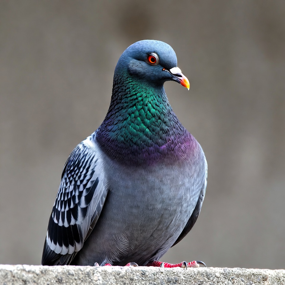 avian, bird, closeup, concrete, feathers, gray pigeon, green neck, iridescent neck, isolated background, orange beak, perched, purple neck, red eyes, red feet, rock pigeon, wildlife, wings, pigeon