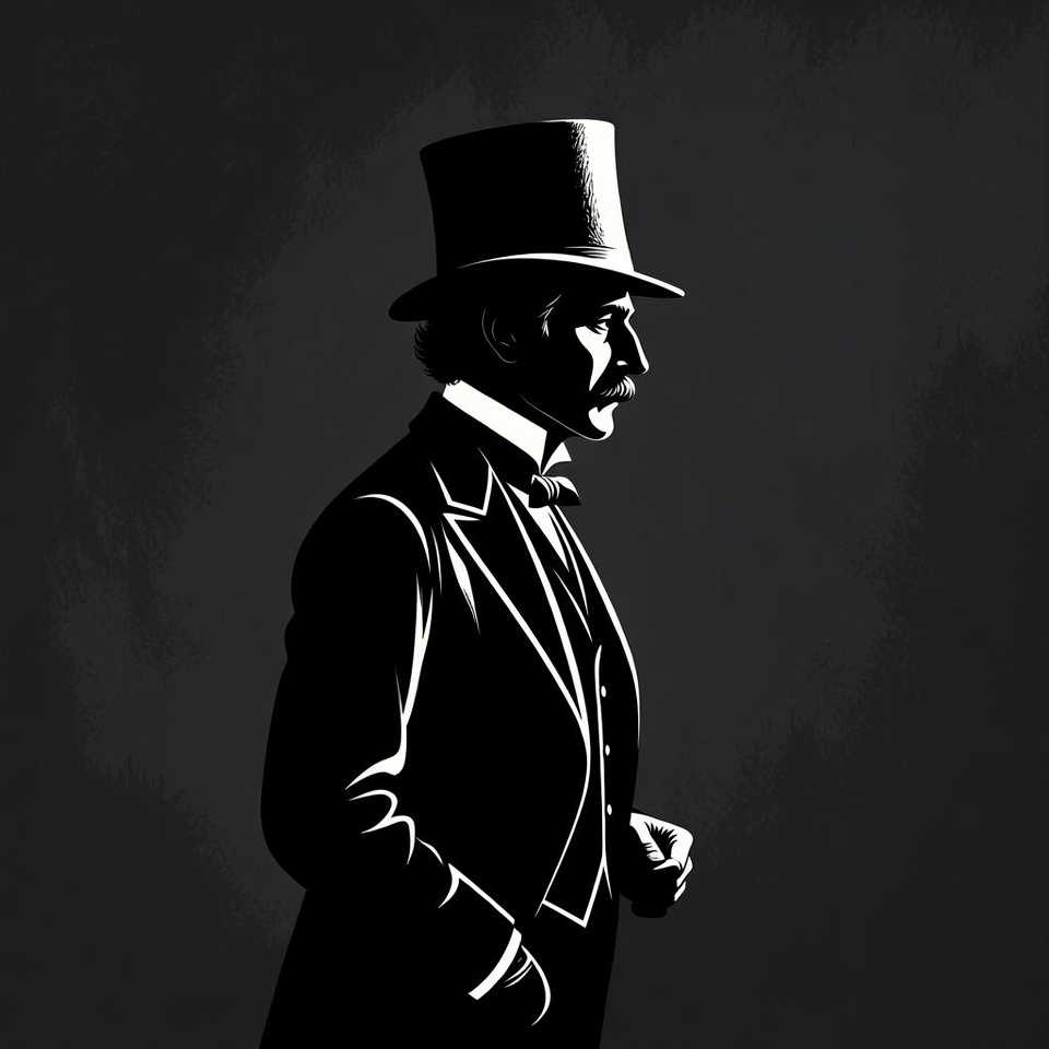A black and white silhouette illustration depicts a man in profile view wearing a tall top hat, tuxedo with bow tie, and collared shirt. He stands with one hand in his pocket against a dark background. The line art style emphasizes sharp contrasts and elegant Victorian attire.