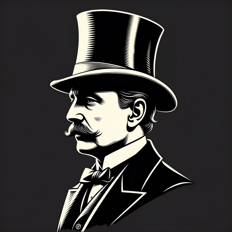 White, black and white, bow tie, classic attire, dark background, elegant man, engraving style, facial hair, formal suit, gentleman portrait, historical figure, illustration, ink drawing, line art, male, monocle absent, mustache, profile view, side profile, top hat, top hat man, vector art, vintage style, Victorian gentleman