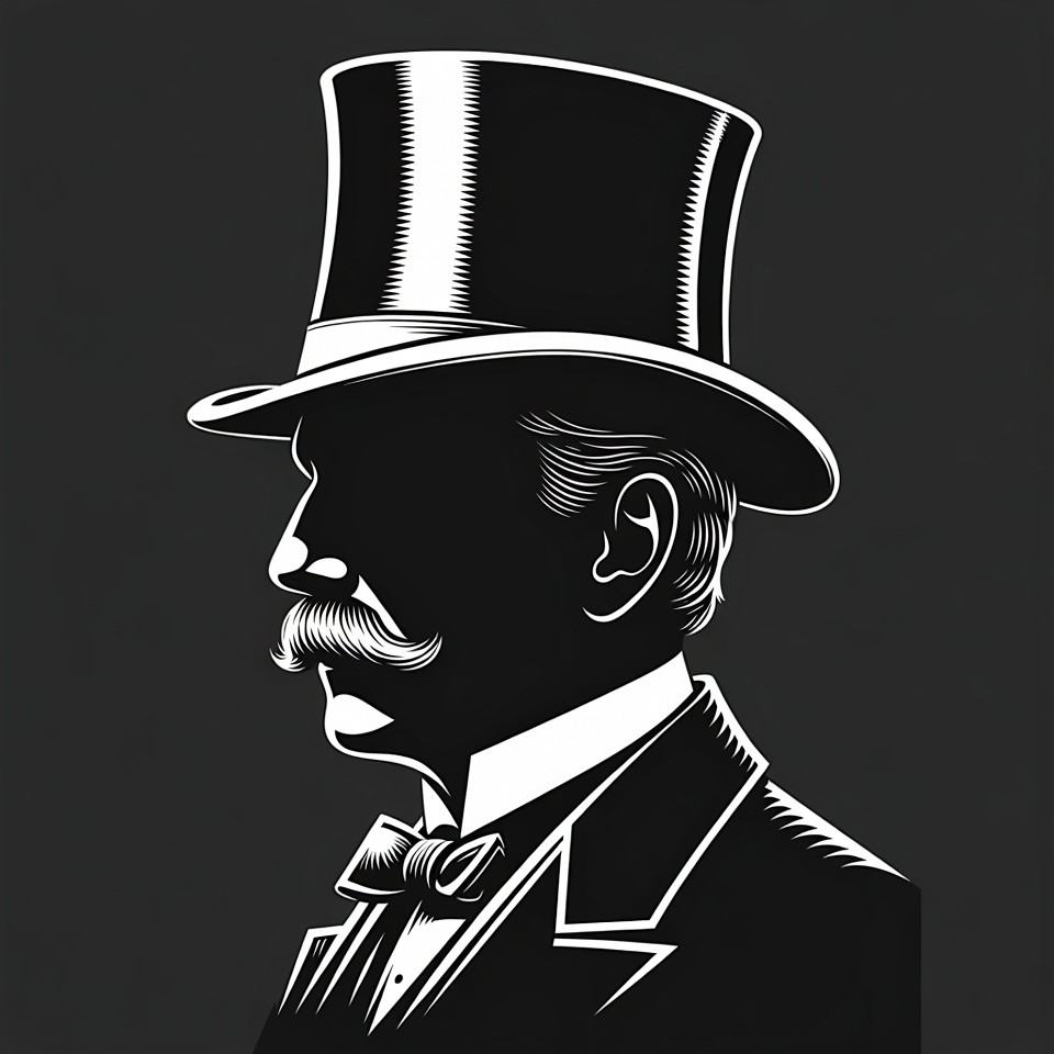 A black and white silhouette illustration depicts a gentleman in profile view. He wears a tall top hat, a bushy mustache, bow tie, and formal tuxedo jacket. The image is rendered in a detailed line art style against a dark background.