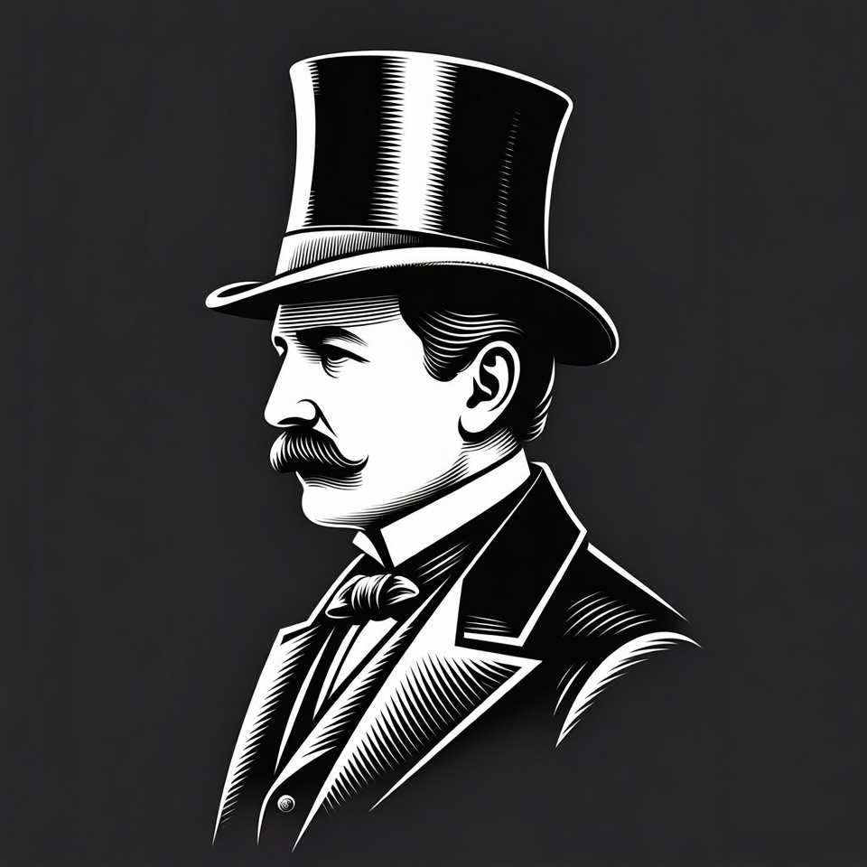 A detailed black and white illustration of a Victorian-era man in profile view. He wears a tall top hat, a neatly trimmed mustache, and a formal suit with bow tie. The artwork features intricate line engravings on a dark background.