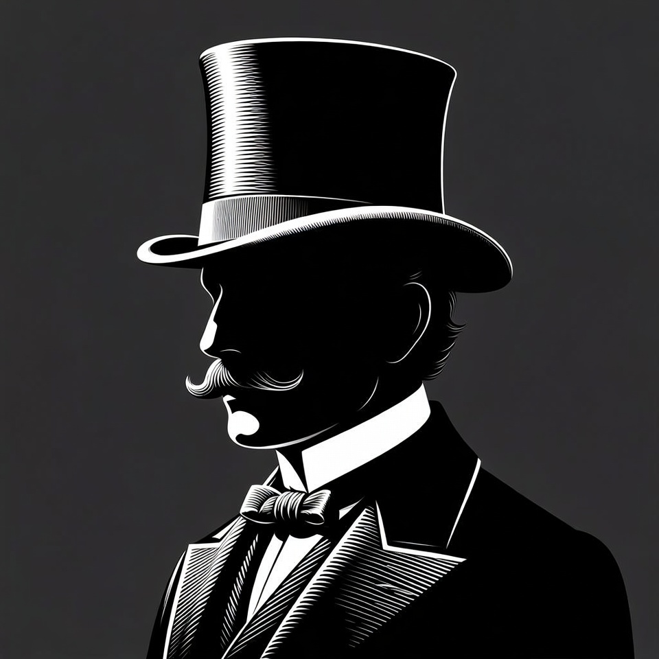 A black and white line art illustration depicts a man's profile silhouette wearing a tall top hat, mustache, bow tie, and formal tuxedo. He stands against a dark gray background with intricate white line detailing on his attire. The image emphasizes elegant Victorian-era fashion in a minimalist style.