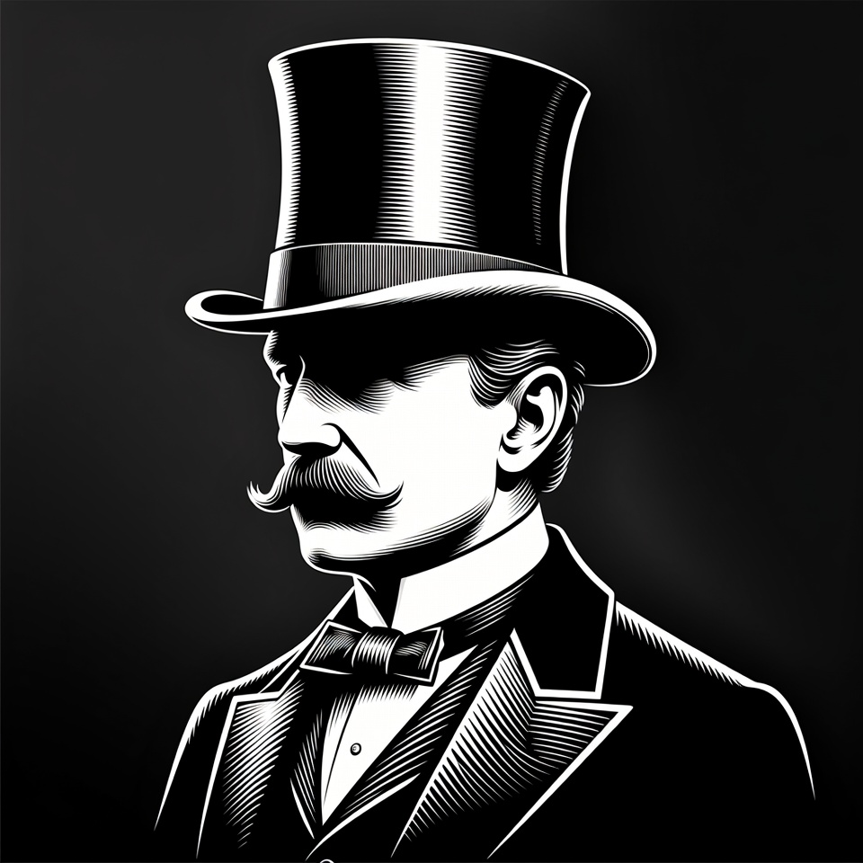 A black and white line art illustration depicts a Victorian-era man in profile view. He wears a tall top hat, a bow tie, and a formal suit with a mustache. His face is partially shadowed against a dark background.