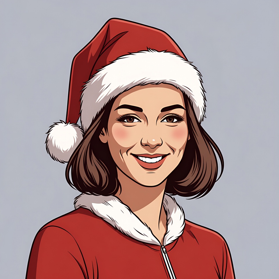 A cartoon illustration of a smiling woman with brown bob hair wearing a red Santa hat with white fur trim and pom-pom. She has a cheerful expression with rosy cheeks and is dressed in a red Santa jacket with white fur collar. The image features a plain gray background.